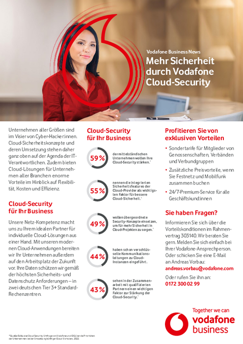 Vodafone hat dies erkannt und bietet deshalb „Cyber Security Services & Consulting“ an: eingehende Beratung und maßgeschneiderte Security-Lösungen für Unternehmen aller Größenordnungen. Dabei profitiert das Düsseldorfer Unternehmen von der umfangreichen Erfahrung, der es beim Betrieb seiner eigenen Netze und Rechenzentren erworben hat. Mitglieder von Genossenschaften, Verbänden und Verbundgruppen kommen auch hier im Übrigen in den Genuss von Sondertarifen und weiteren Preisvorteilen.
