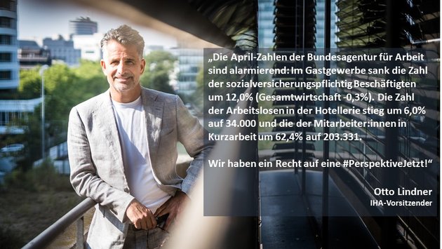 „Die April-Zahlen der Bundesagentur für Arbeit sind alarmierend: Im Gastgewerbe sank die Zahl der sozialversicherungspflichtig Beschäftigten um 12,0% (Gesamtwirtschaft -0,3%). Die Zahl der Arbeitslosen in der Hotellerie stieg um 6,0% auf 34.000 und die der Mitarbeiter:innen in Kurzarbeit um 62,4% auf 203.331.