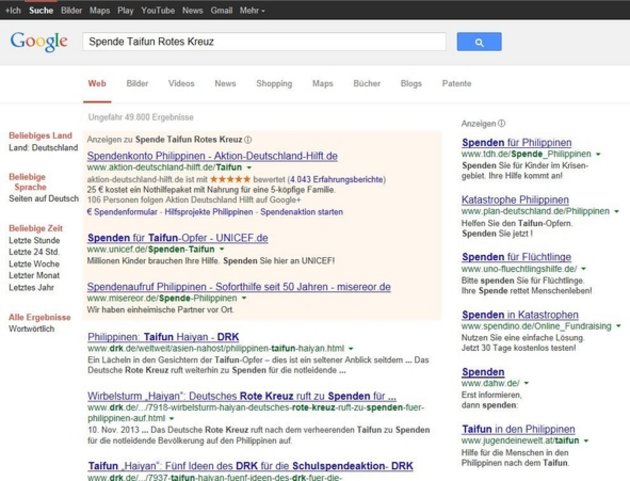 Auf diese Kombination von Suchbegriffen waren Google AdWords anderer Hilfsorganisationen geschaltet, die offensichtlich ihre Spendenmittel auch dazu einsetzen, dem Roten Kreuz den von mir zugedachten Betrag noch abzujagen und auf die eigenen Spendenkonten zu lenken! Ich habe jedenfalls auf meine Suchanfrage („Navigational Search“!), Werbebanner anderer gemeinnütziger (z.B. Arbeiter-Samariter-Bund, CARE, Paritätischer Wohlfahrtsverband, SOS Kinderdörfer, Terre des hommes), regierungsnaher (z.B. Unicef) oder kirchlicher (z.B. Adveniat, AWO, Johanniter-Unfall-Hilfe, Malteser Hilfsdienst, Misereor) Organisationen eingeblendet bekommen.