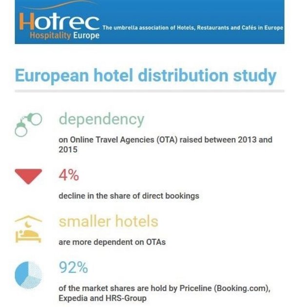 Zu diesen Ergebnissen kommt eine europaweite Befragung von über 2.000 Hoteliers, die von HOTREC, dem europäischen Dachverband der Hotels, Restaurants und Cafés, gemeinsam mit seinen europäischen Partnerverbänden und in Zusammenarbeit mit dem Institut für Tourismus der Fachhochschule Westschweiz Wallis zu Beginn des Jahres 2016 durchgeführt wurde. Demnach wurden im Jahr 2015 in Europa durchschnittlich mehr als 22 Prozent aller Hotelübernachtungen über OTA generiert (+ 3 Prozentpunkte im Vergleich zu 2013). Parallel zum Wachstum der Buchungsportale sank der Anteil der direkten Buchungen (online und offline) beim Hotel um insgesamt 4 Prozentpunkte.