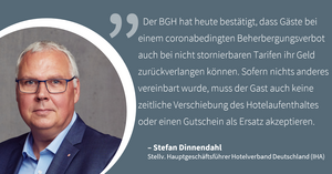 Der BGH hat heute bestätigt, dass Gäste bei einem coronabedingten Beherbergungsverbot auch bei nicht stornierbaren Tarifen ihr Geld zurückverlangen können. Sofern nichts anderes vereinbart wurde, muss der Gast auch keine zeitliche Verschiebung des Hotelaufenthaltes oder einen Gutschein als Ersatz akzeptieren.